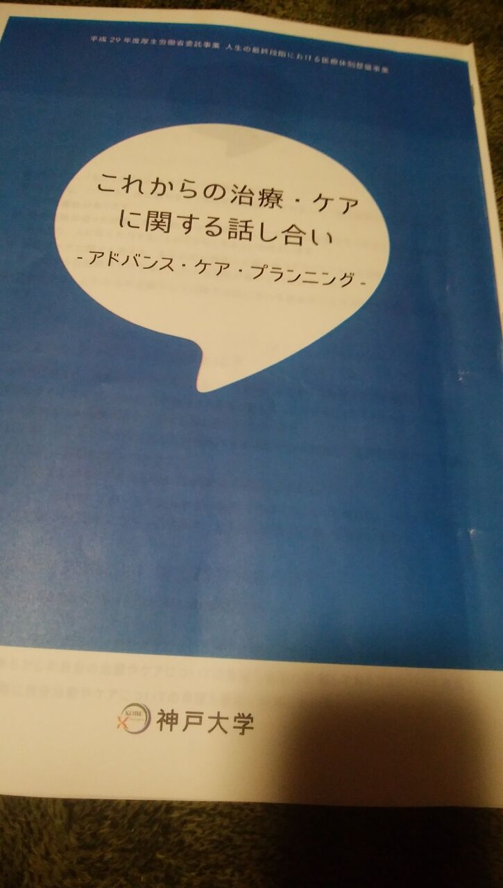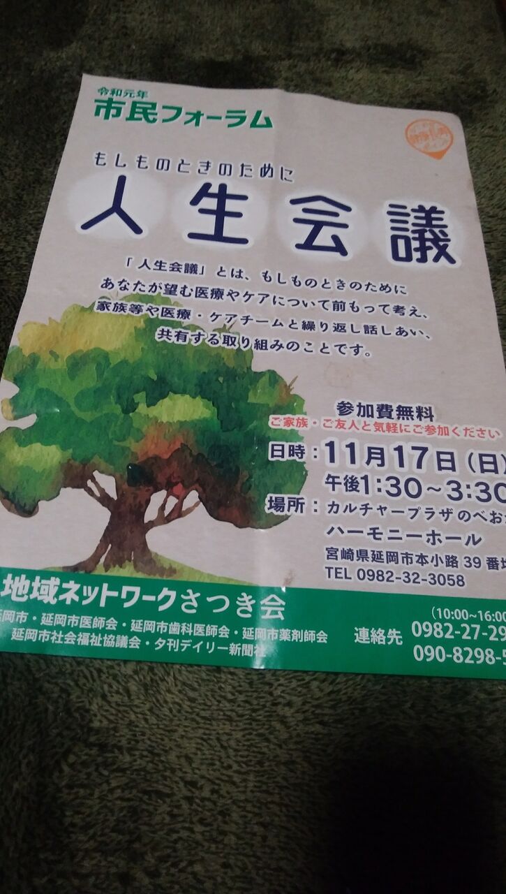 2019年11月17日 人生会議 今日の日曜日は川南小学校の親子参観日で、息子が一人で空人と茜の教室をかけもって授業参観したみたいです。息子のことだから涙しながらの参観日だったのではと思います。今日は、誘われて市民フォーラム 「もしものときのために人生会議」に参加しました。私の両親はすでに亡くなって、主人の両親も亡くなって、義母は3年前に自宅で看取りました。なので、これからは自分たちのことを考える時です。自分たちのことだけではなくて家族で話し合う時を持たないといけないと思いました。終了後に、写真展を見ました。そして、誘ってくれたŢ子さんと三人で金堂ケ池を歩きました。